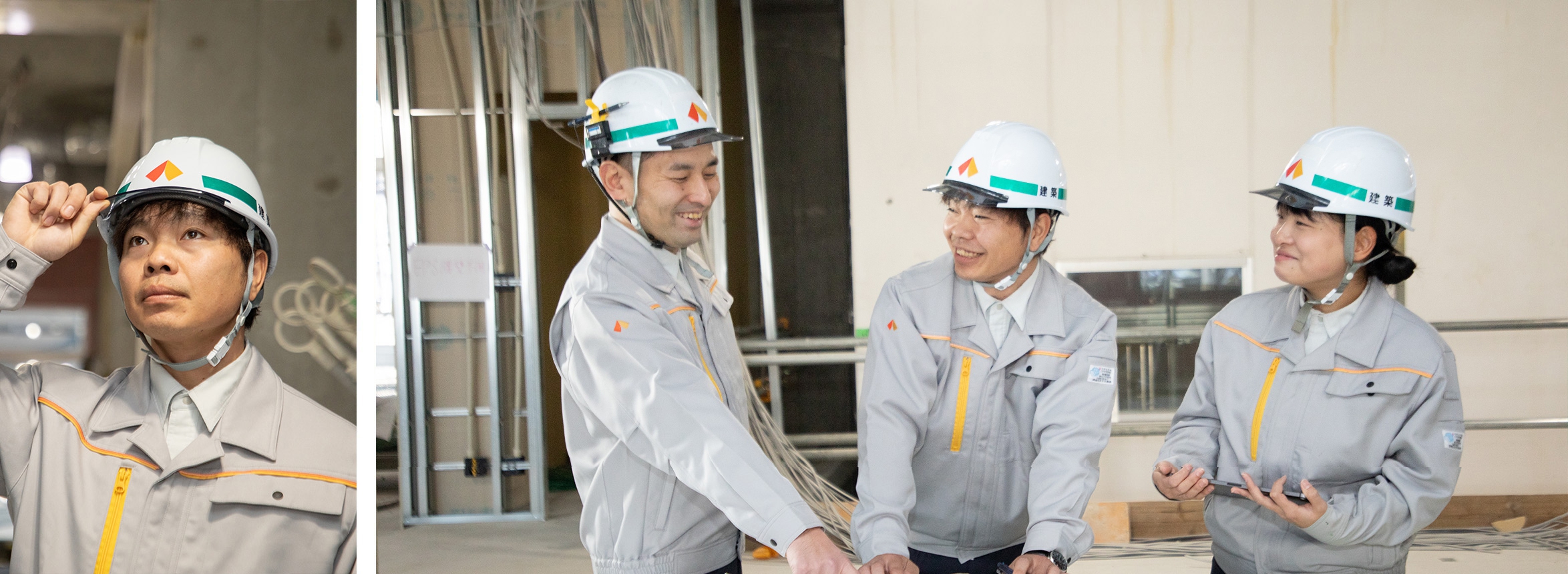また、安全管理も非常に重要な仕事です。特に今の現場は既存の校舎の横に新校舎を建設しているので、敷地内にいる生徒や学校関係者に危険がないよう、一層の注意を払っています。工程管理や安全管理で覚えることは多岐にわたりますが、個人で抱えこまずチーム一丸となって仕事を進めていくので、不安を感じることはありません。職場の雰囲気も和やかですし、事務所の中は常に話し声や笑い声が聞こえるような環境で、入社前のイメージ通り、明るい雰囲気の中で働いています。